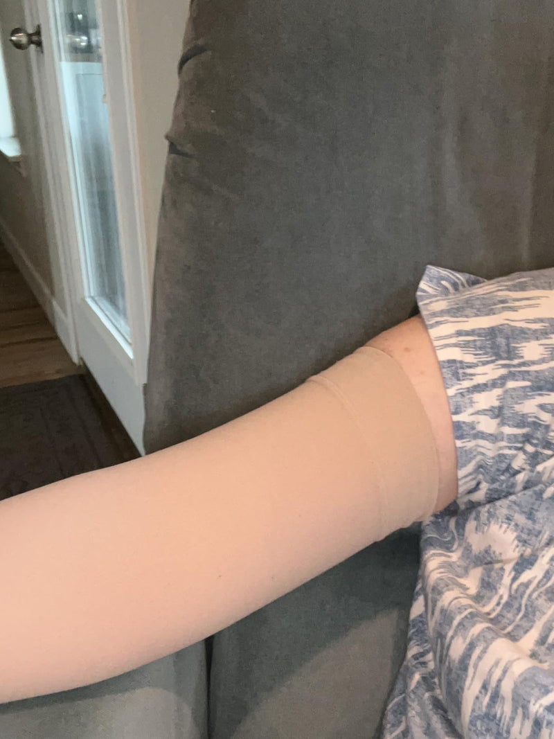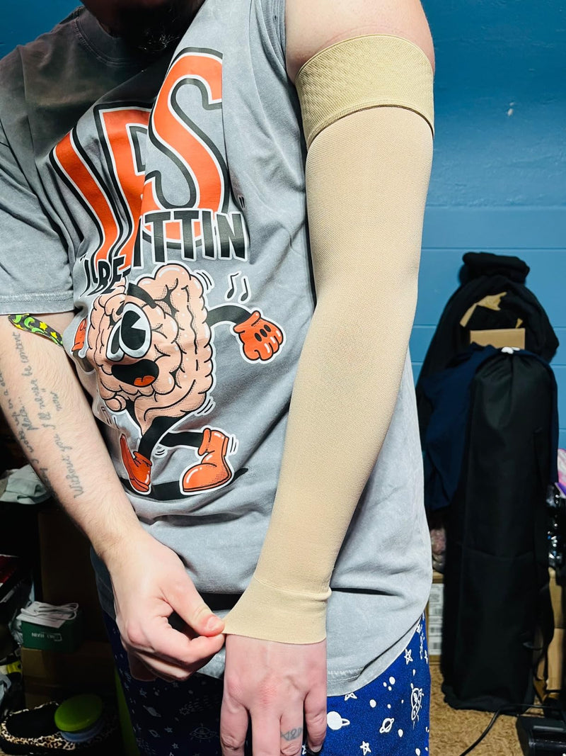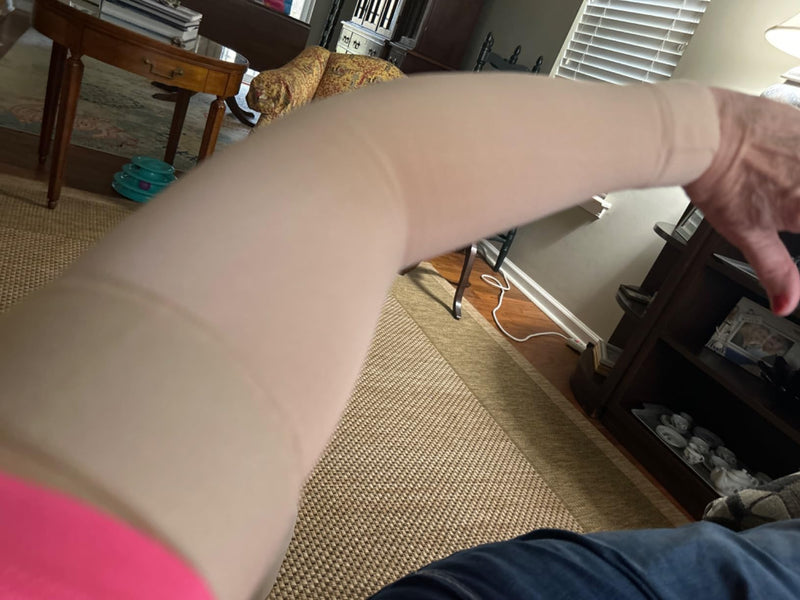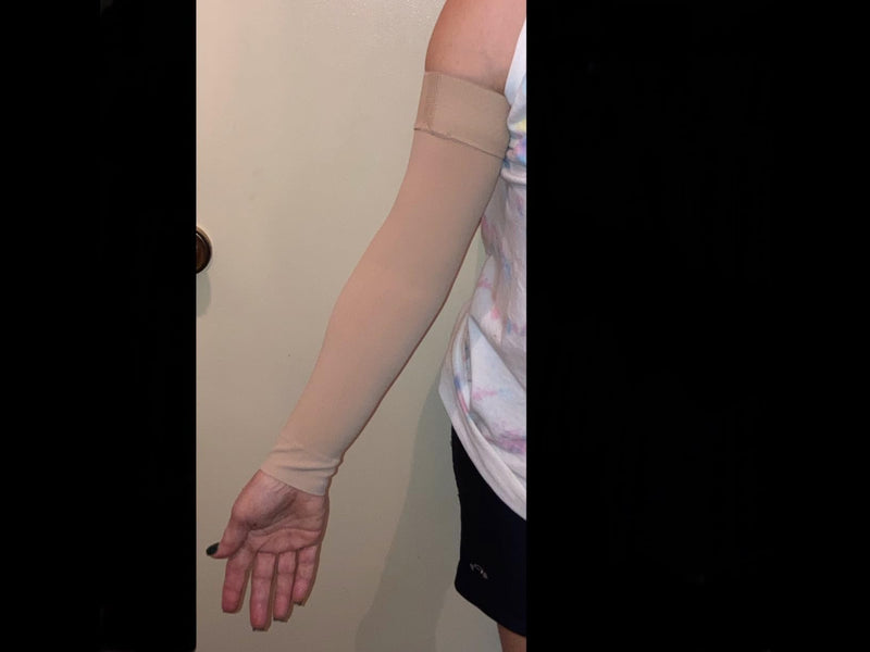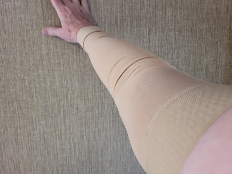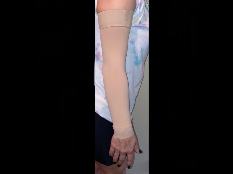 Start with clean, dry skin and turn the sleeve inside out, then insert your hand and gradually roll the fabric up your arm, smoothing as you go. The top band should rest 1-2 inches below your armpit with the silicone gripper lying flat. Wear it during all waking hours (remove for bathing and sleep), and wash daily in cool water with mild detergent—air dry only, never use heat. Daily washing extends your sleeve's life by resetting the elastic. Own at least two sleeves so you can rotate while one dries, and replace every 3-6 months or when it feels loose or slides down—a worn-out sleeve can worsen swelling.